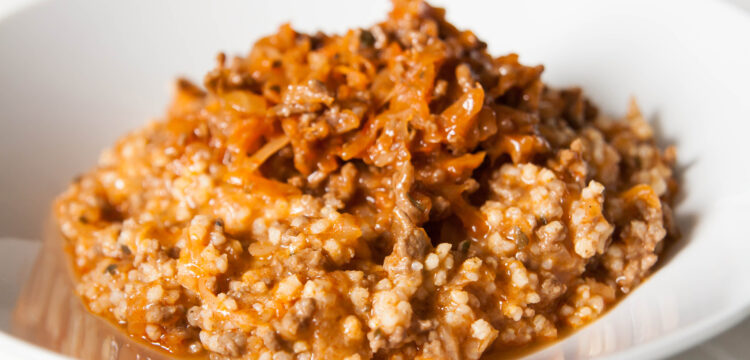 - Olje segrejemo in na njem zarumenimo nasekljano čebulo. Dodamo strt česen in meso, ki ga dobro premešamo in mešamo, dokler ne porjavi.